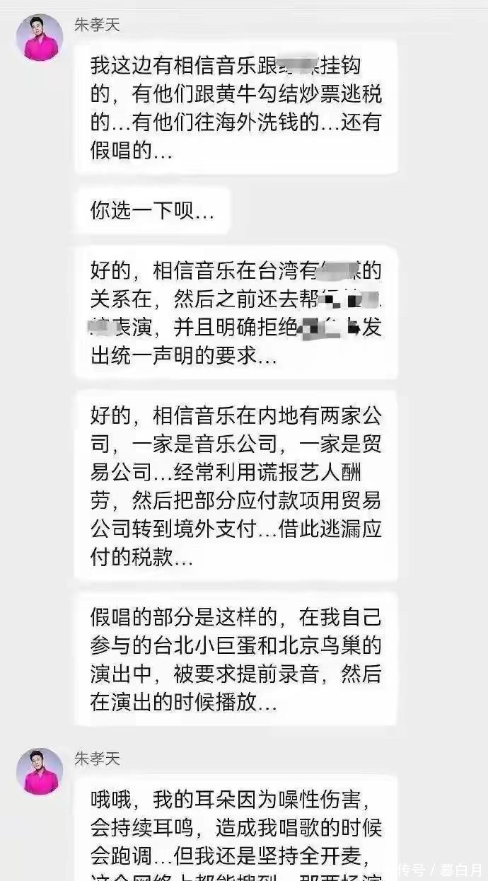 三大核心指控引关注朱孝天在粉丝群中详细列举了三大指控:黄牛勾结逃税:指控"相信音乐"通过特定票务平台与黄牛合作,将演唱会票价炒高后平分利润,并利用黄牛渠道逃漏高额票价的税款。跨境洗钱逃税:揭露该公司在内地设立两家关联公司(一家音乐公司、一家贸易公司),通过虚构艺人酬劳,将资金转移至境外。强制假唱争议:自曝在台北小巨蛋、北京鸟巢演出期间曾被要求提前录音,现场演出时播放录音。
